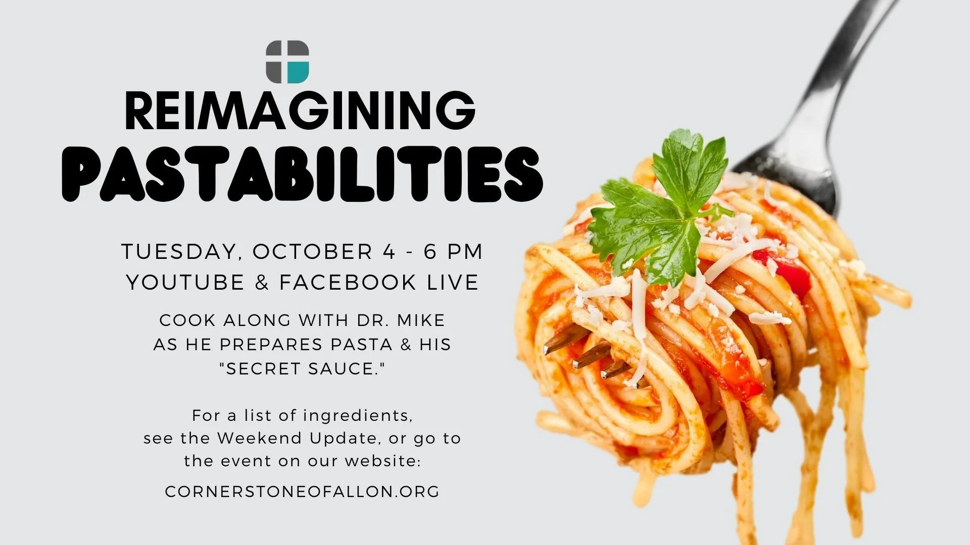 Dr. Mike invites you to cook a meal of pasta with him in “Reimagining PASTAbilities.” Tune in to Cornerstone’s YouTube or Facebook Live channel at 6 PM on Tuesday, October 4th, as Dr. Mike prepares pasta and shares his “Secret Sauce Recipe.” This is part of the 24/7 Team’s “Reimagining Possibilities” campaign for 2022. And a bonus feature: Dr. Mike might also answer the question “Does Dr. Mike enjoy eating broccoli?”.