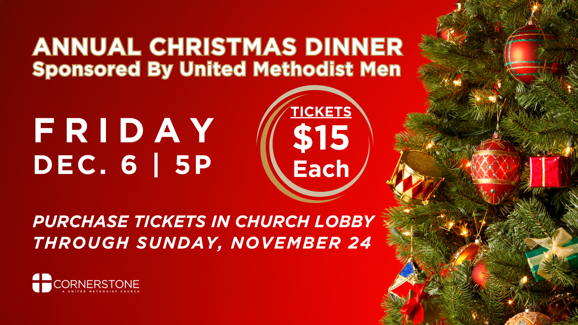 The United Methodist Men of Cornerstone UMC are selling tickets in the lobby to the annual Christmas Dinner scheduled for Friday, December 6 at 5p.